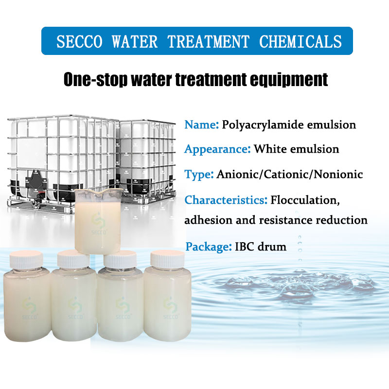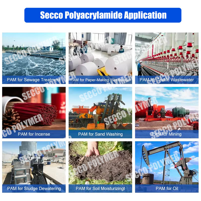 Poliakrilamid emülsiyonu, çeşitli ev kanalizasyonu, kimyasal atık su, petrol sahası kanalizasyonu, çamur sulandırma, kağıt ve diğer alanlarda yaygın olarak kullanılır. Poliakrilamid su-yağ emülsiyonu kentsel kanalizasyon arıtması, bira fabrikası, nişasta fabrikası, gıda işleme tesisleri ve diğer kanalizasyon arıtmalarında da yaygın olarak kullanılır. Organik süspansiyon katıların asidik veya asidik atıklarda flokülasyonunun atılması özellikle uygulanabilir. Kağıt endüstrisinde, bir tutma yardımcı filtresi, kağıt yapımı kanalizasyon arıtması olarak kullanılabilir. Petrol endüstrisi sondaj emülsiyon kaplama ajanı veya yağsızlama ajanı olarak kullanılabilir.